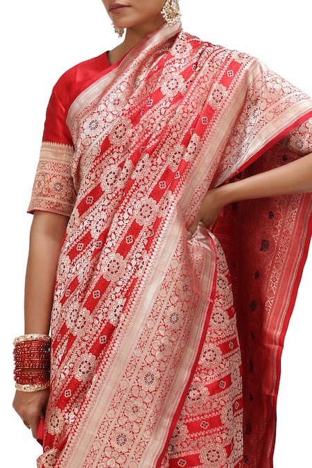 Red saree in satin silk featuring zari embroidery in floral jaal pattern