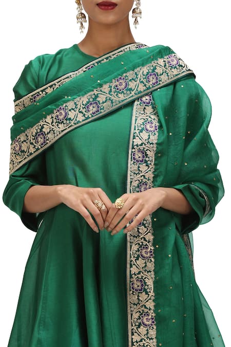 Buy_Mimamsaa_Emerald Green Organza Silk Woven Floral Applique Jaida Border Dupatta _at_Aza_Fashions