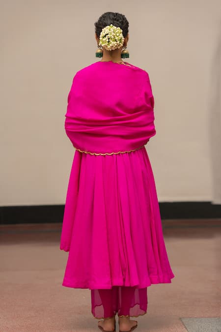 Fuchsia anarkali featuring a round neckline and churidar sleeves with floral placement embroidery. Paired with a matching pant and scallop trimmed organza silk dupatta.