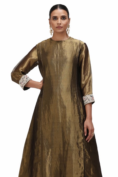 Buy_Mimamsaa_Gold Tissue, Silk Pearls, Sequins, Kala Metallic Anarkali With Sheer Panel Pant _Online_at_Aza_Fashions