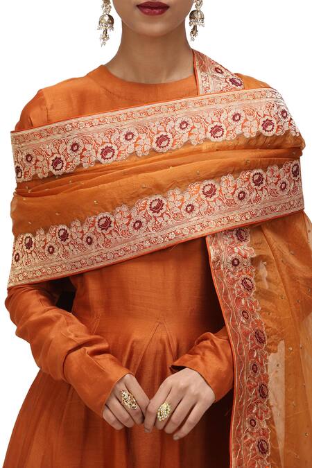 Rust orange dupatta featuring woven floral applique brocade border and sequin embellishments