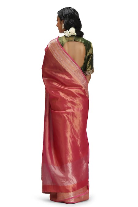 Pink tissue silk saree featuring intricate golden borders. Paired with a stitched blouse in contrasting green with embellished sleeves.