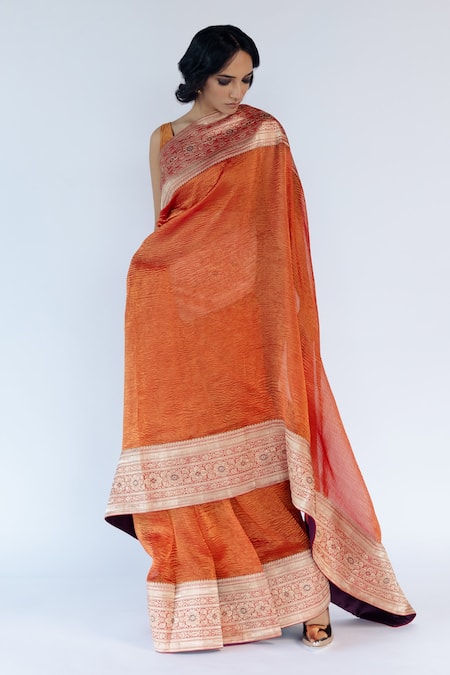 Orange Tissue Silk Embroidered Mysha Hand Crushed Saree