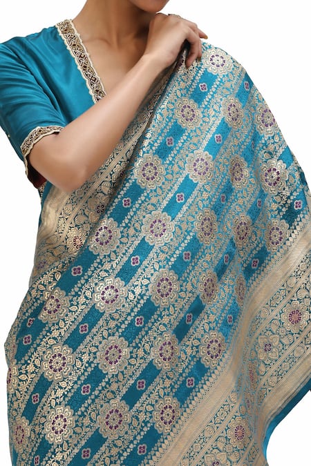 Aegean blue bridal saree featuring heavy bloom jaal design with brocade zari and mina flower motifs using fekwa weaving technique