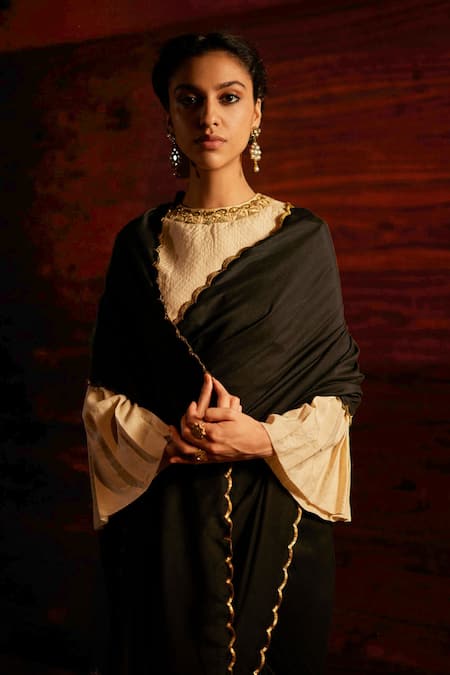 Black Silk Sequins Round Neck Olivia Woven Saree With Blouse Piece