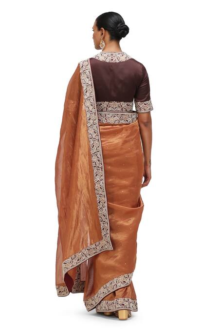 Brown tissue silk saree featuring floral embroidery and woven patterns