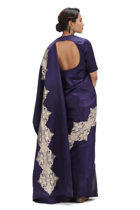 Royal blue saree featuring woven floral vine placement motif. Paired with a plain blouse with a cut-out back.