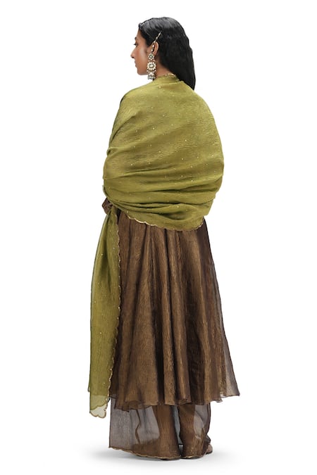 Gold metallic woven anarkali featuring a textured base and V-neckline. Paired with matching pants and an olive green sequin embroidered scalloped dupatta.