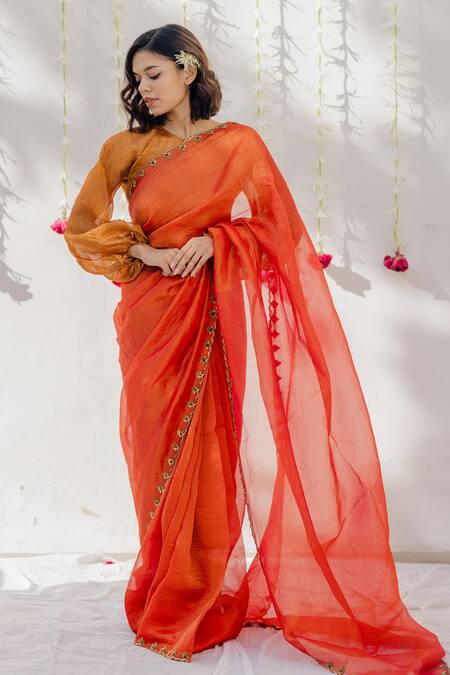 Blood orange tissue saree with floral sequin embellished border. Comes with an apricot unstitched blouse piece.