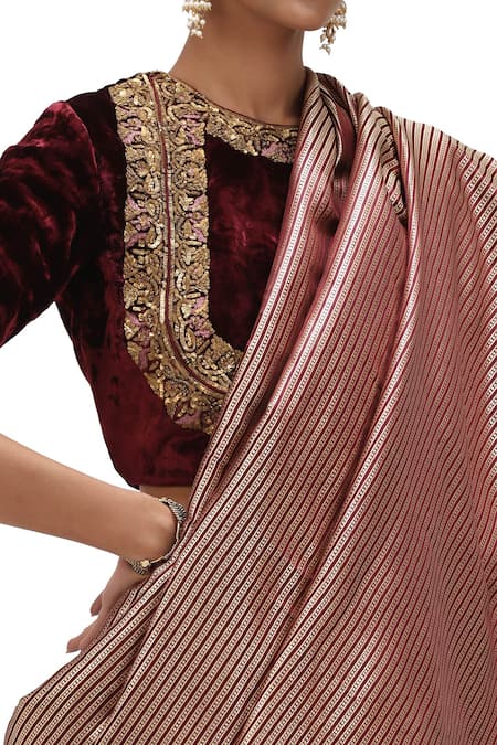 Buy_Mimamsaa_Wine Satin, Silk Vaiga Danda Weave Pattern Saree _at_Aza_Fashions