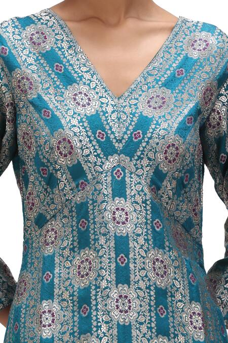 Blue A-line kurta featuring floral motifs and a V-neckline. Paired with a flared pant in brocade silk.