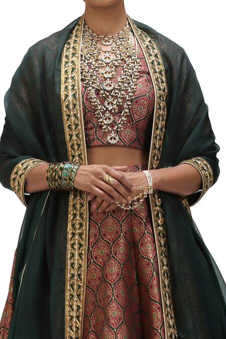 Emerald green dupatta with sequin motif embroidered border, Back tie-up detail on the blouse, All over zameen & alfi motifs woven in garnet & gold tone