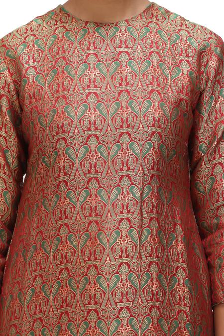 Garnet red kurta featuring green and gold inverted bird motifs with three-quarter sleeves. Paired with a matching flared pant in brocade silk.
