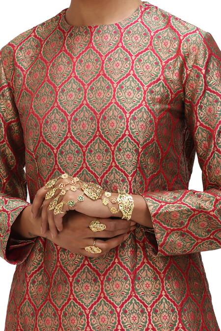 Red brocade silk kurta featuring green and gold alfi motifs with a round neckline and long sleeves. Paired with a flared pant for a complete look.