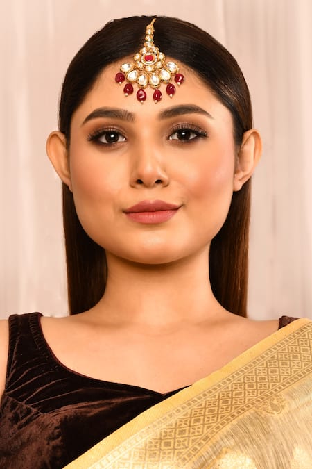 22K gold plated maangtikka featuring floral motifs and embellished with ruby color beads