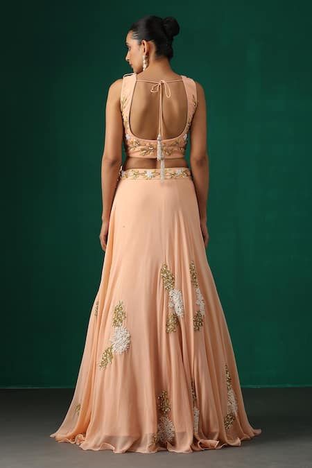 Peach lehenga with floral thread embroidery highlighted with pearls & sequins. Comes with embroidered blouse, dupatta & belt.