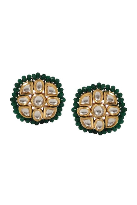 Minaki_Green Beads, Diamonds Geometric Carved Earrings _Online_at_Aza_Fashions