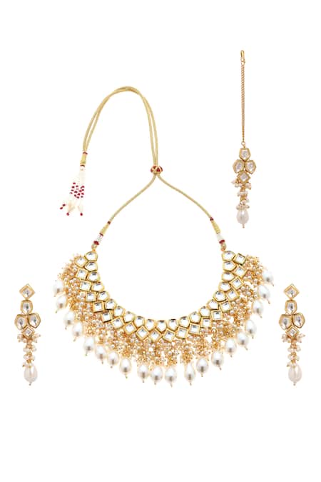 Buy_Minaki_White Pearls, Stones Geometric And Kundan Necklace Set _at_Aza_Fashions
