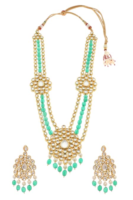 Gold jewelry set featuring a long floral pendant necklace and a bead drop choker. Includes a pair of earrings adorned with emerald bead and pearl drops.