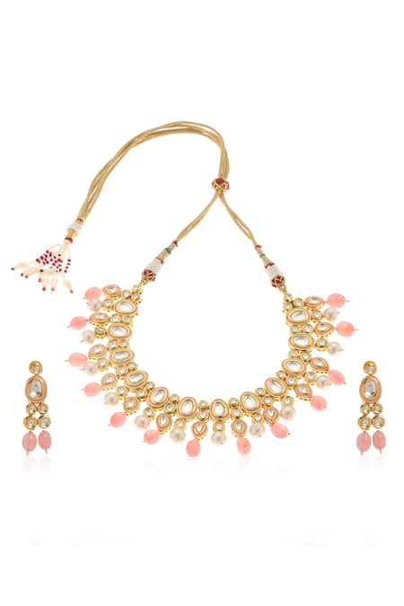Gold choker featuring kundan motifs embellished with peach meenakari detailing and pearl, peach bead drops. Paired with matching kundan earrings.