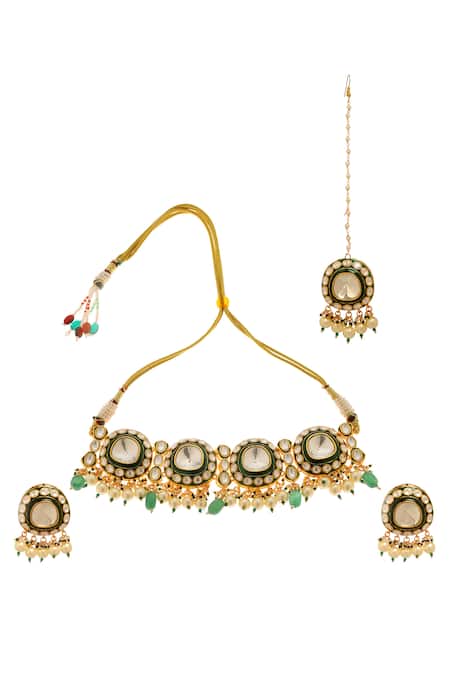 Buy_Minaki_Green Metallic Thread, Pearls, Stones Kundan Embellished Choker Necklace Set_Online_at_Aza_Fashions