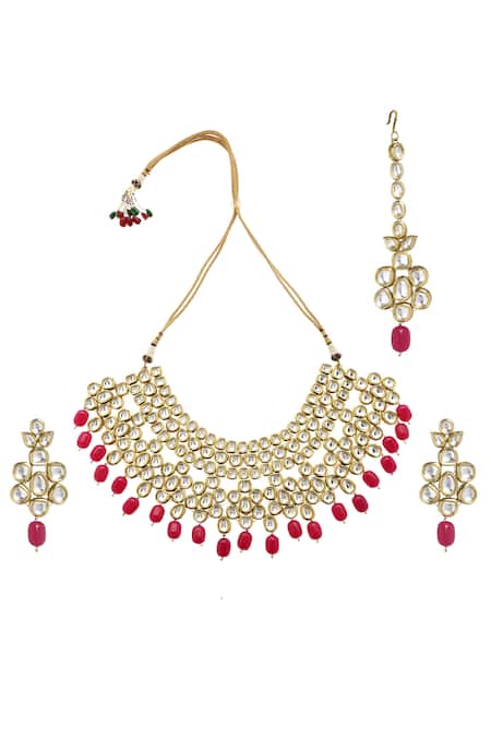 Gold choker featuring encrusted kundan and ruby color stone drops. Paired with matching danglers and floral maangtikka.