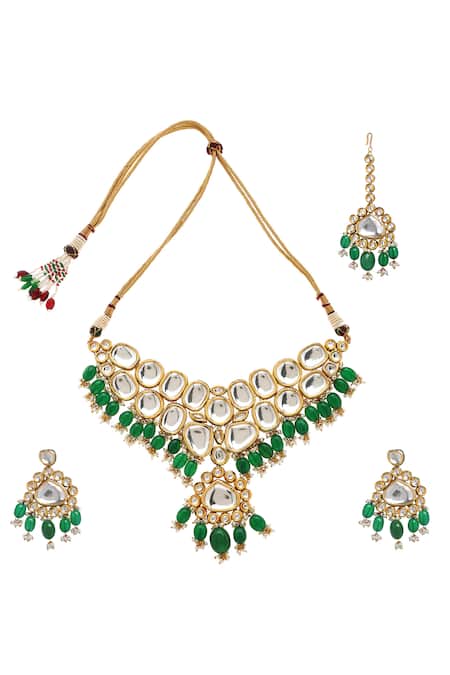 Gold choker featuring geometric motifs with kundan and emerald stone drops. Paired with matching earrings and a floral maangtikka.