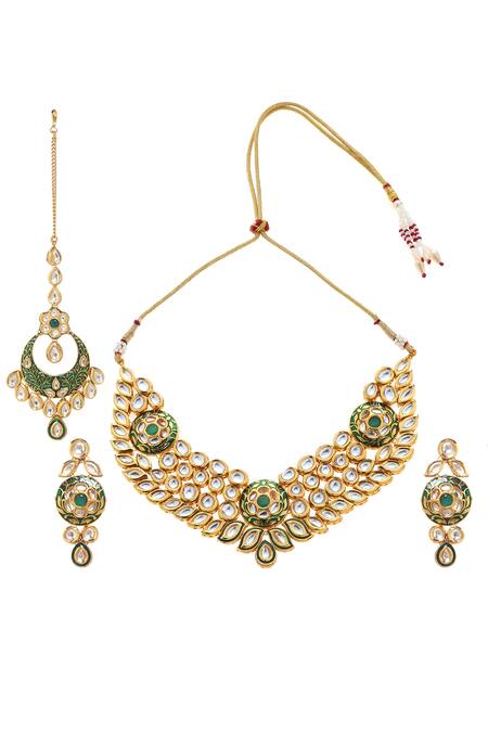 Buy_Minaki_Green Metallic Thread, Diamonds Meenakari Work Necklace Set_at_Aza_Fashions
