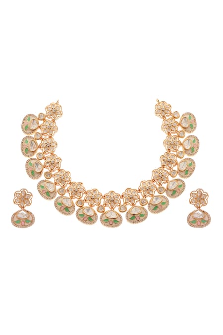 22k gold plated finish, Embellished with pink and green meenakari, Carved floret units in design