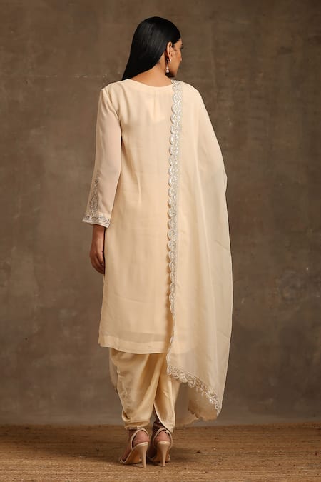 Ivory straight kurta featuring sequin embellished threadwork floral motifs with potli detail. Paired with matching dhoti pant and scalloped dupatta.