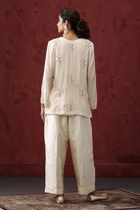 Ivory Silk, Georgette Sequins, Crystals Embellished Slit Sleeve Kurta With Pant