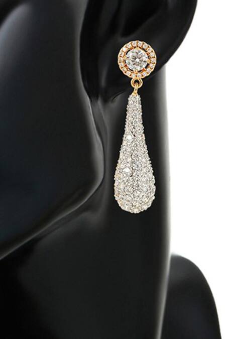 Gold danglers featuring a circular top and encrusted dual-tone zircon stones. Size dimensions are 47 x 12 mm.
