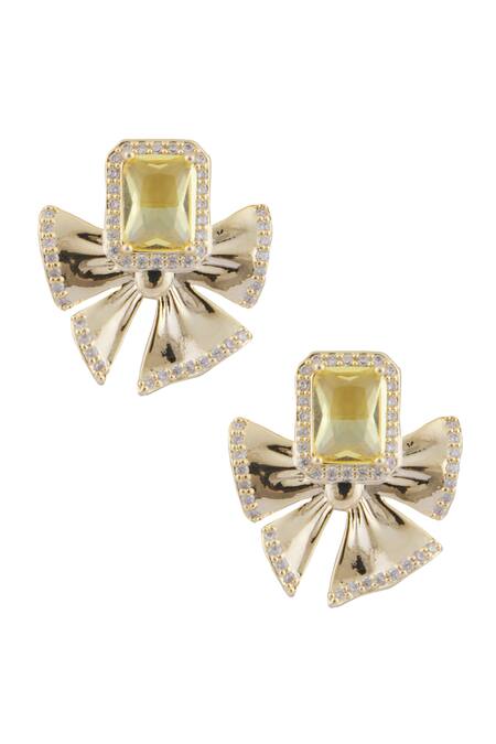 Yellow stud earrings featuring a bow carved motif with geometric cut work