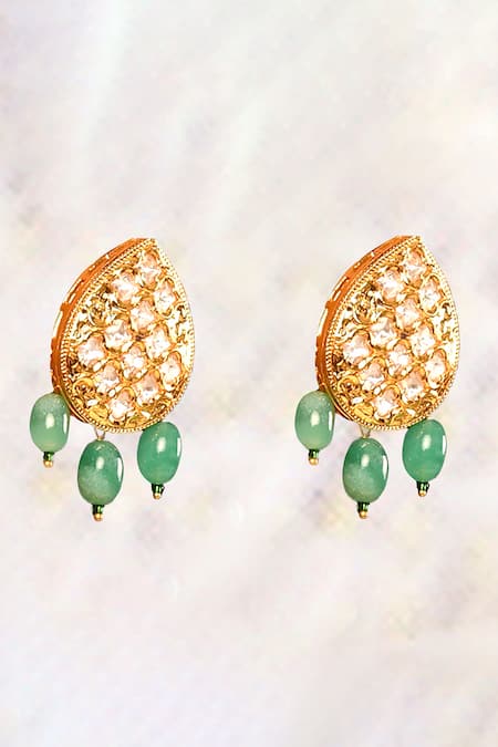 22K gold plated choker featuring kundan setting and embellished with emerald color beads. Paired with matching earrings showcasing teardrop motifs and bead drops.