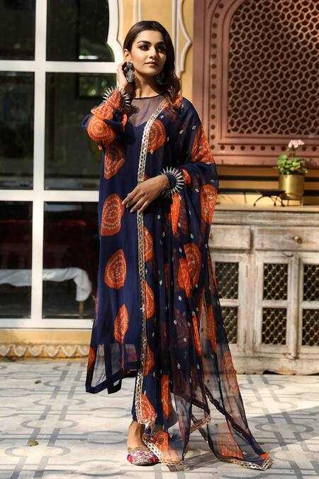 Buy_Gulabo Jaipur_Blue Cotton, Georgette Bandhani Boat Minal Print Kurta Set_at_Aza_Fashions