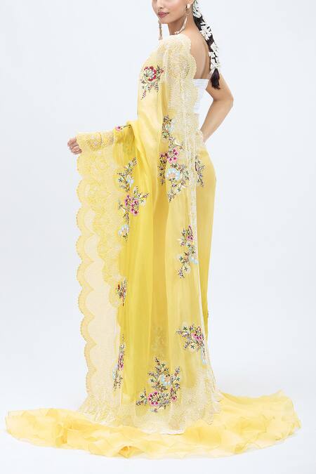 Yellow organza saree featuring scalloped border, pearl work, and multi-colored floral embroidery. Includes a matching embroidered unstitched blouse piece.