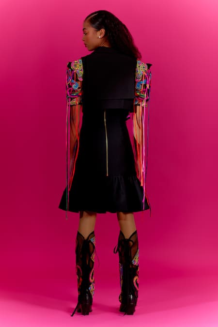 Black crepe jacket featuring aari and beaded applique embroidered multi-layered motifs. Paired with a sleeveless dress with a tube neck and structured sleeves.