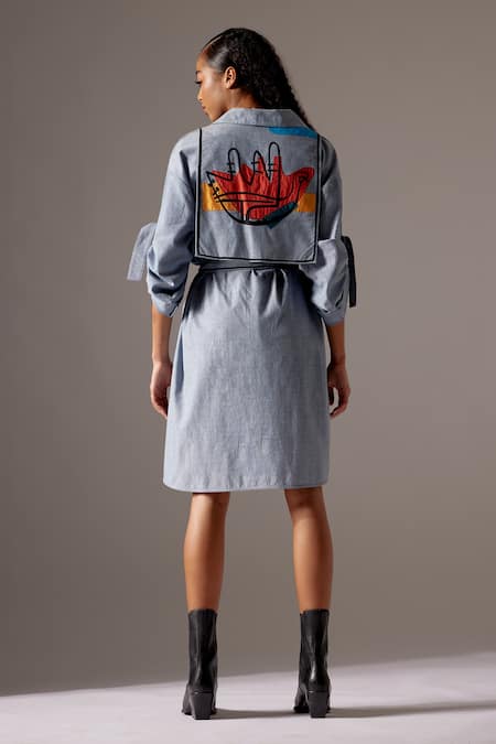 Blue linen oversized blazer dress featuring aari and thread applique embroidered back