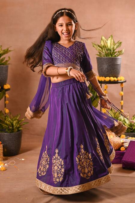 Purple Silk, Cotton, Net Sequins, Embroidery Angrakha Top Lehenga Set