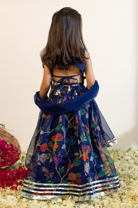 Navy blouse featuring shell detailing around the neckline with tassels and back tie-up detailing. Paired with a floral printed lehenga and a dupatta.