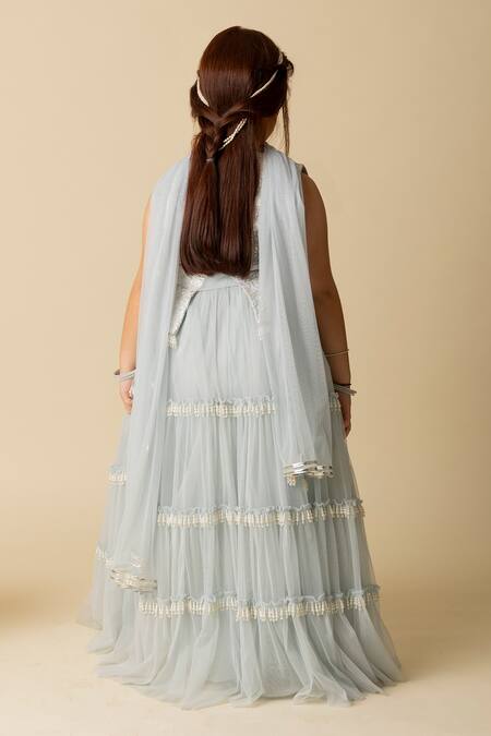 Ice blue lehenga featuring floral embroidery and pearl latkan detailing. Paired with a matching blouse and dupatta.