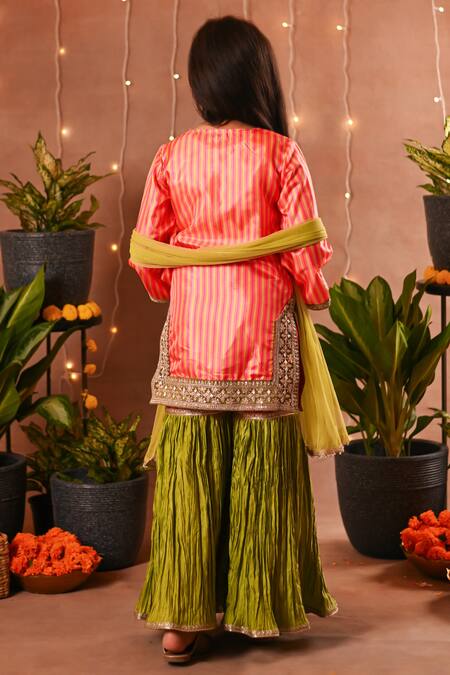 Pink kurta featuring a striped print with thread and sequins embroidery. Paired with a crinkled sharara and a coordinating dupatta.