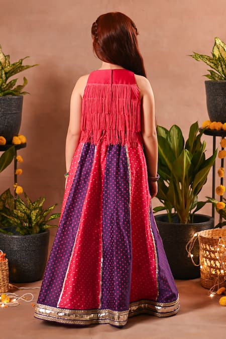 Pink lehenga featuring bandhani print with zari and gota patti embroidery. Paired with a fringed sleeveless top, this set is made from cotton voile and silk chanderi.