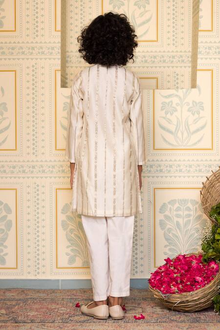 Beige kurta featuring zari work in a stripe pattern with full sleeves and a collared neckline. Paired with solid pants for a complete look.