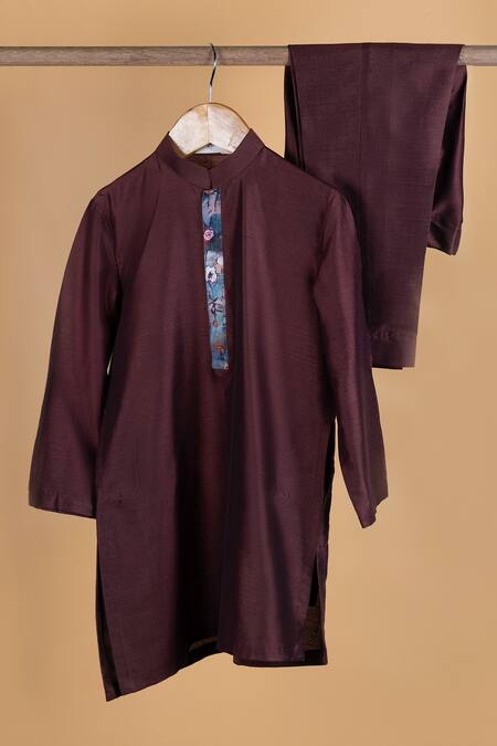 Wine bundi featuring blossom print with a mandarin collar and front zipper. Paired with a matching kurta and pant with a semi-elasticated waistband.