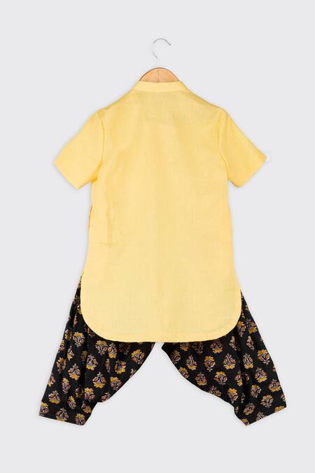 Yellow kurta featuring placement embroidered penguin motifs on front pockets. Paired with a black floral print patiala with front pockets and button detailing.