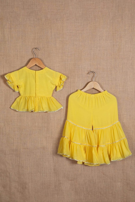 Yellow peplum top featuring floral embroidery with gota work borders. Paired with a tiered sharara for a festive look.