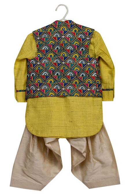 Multi printed jacket featuring a band neckline and buttoned cuffs. Paired with a yellow pathani pant and gold patiala.