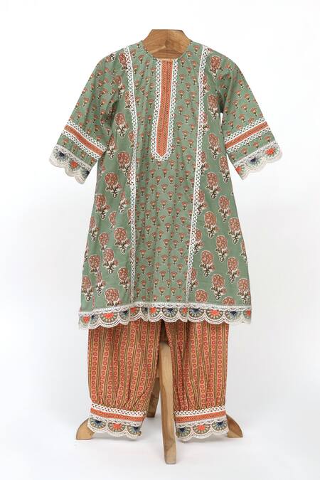 Olive green kurta featuring floral hand block print and scallop embroidered lace hem. Paired with stripe print harem pant.