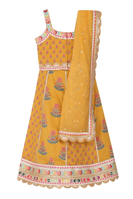 Mustard yellow kalidar lehenga featuring all over wildbloom print and gota lace-sequin embellishments. Paired with a matching sleeveless blouse and a scallop border embellished dupatta.